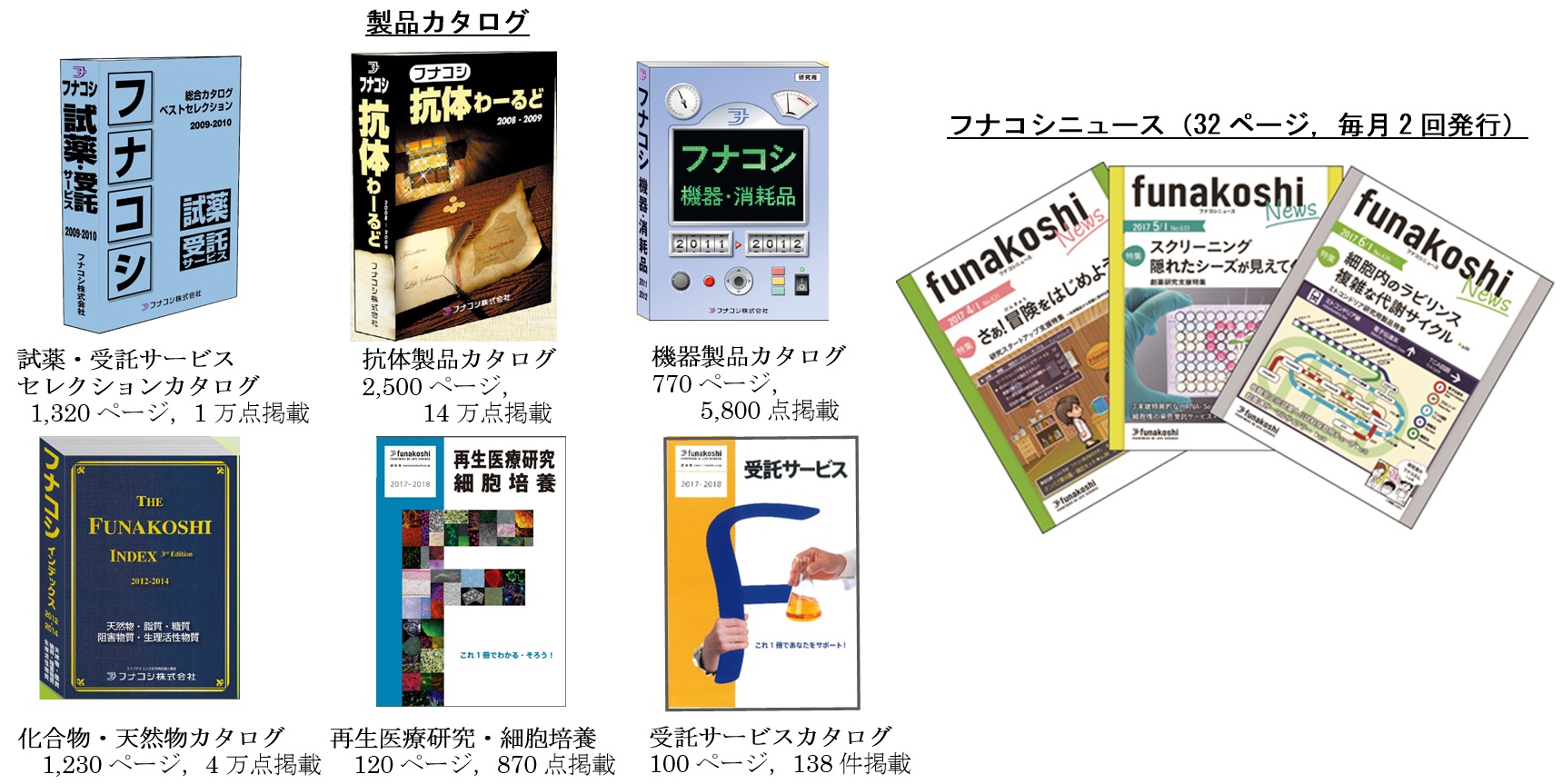 総合カタログ第一号の発刊は1976年。現在のようにウェブ検索が無かった時代に研究者にとって貴重な情報源でした。また、冊子「フナコシニュース」は1986年の発刊から現在まで通巻640号を超え、新製品情報を32ページの冊子で毎月2回お届けするというのは世界でも類をみない取り組みです。